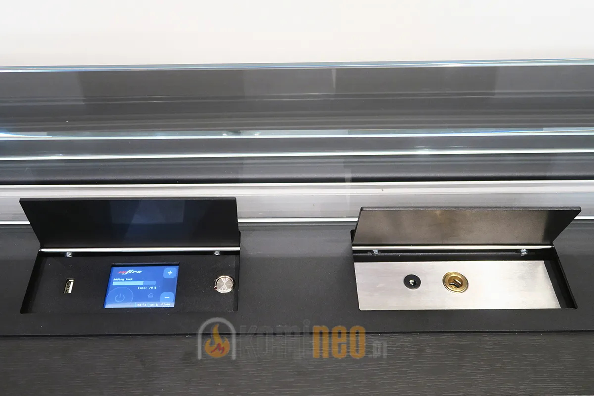 INFIRE ETRONIC C 1200 posiada ekran dotykowy ukryty pod stalową klapką, która chroni elektronikę przed nagrzewaniem się podczas pracy urządzenia. Dlatego też należy pamiętać, aby podczas palenia w biokominku klapka była zawsze zamknięta.