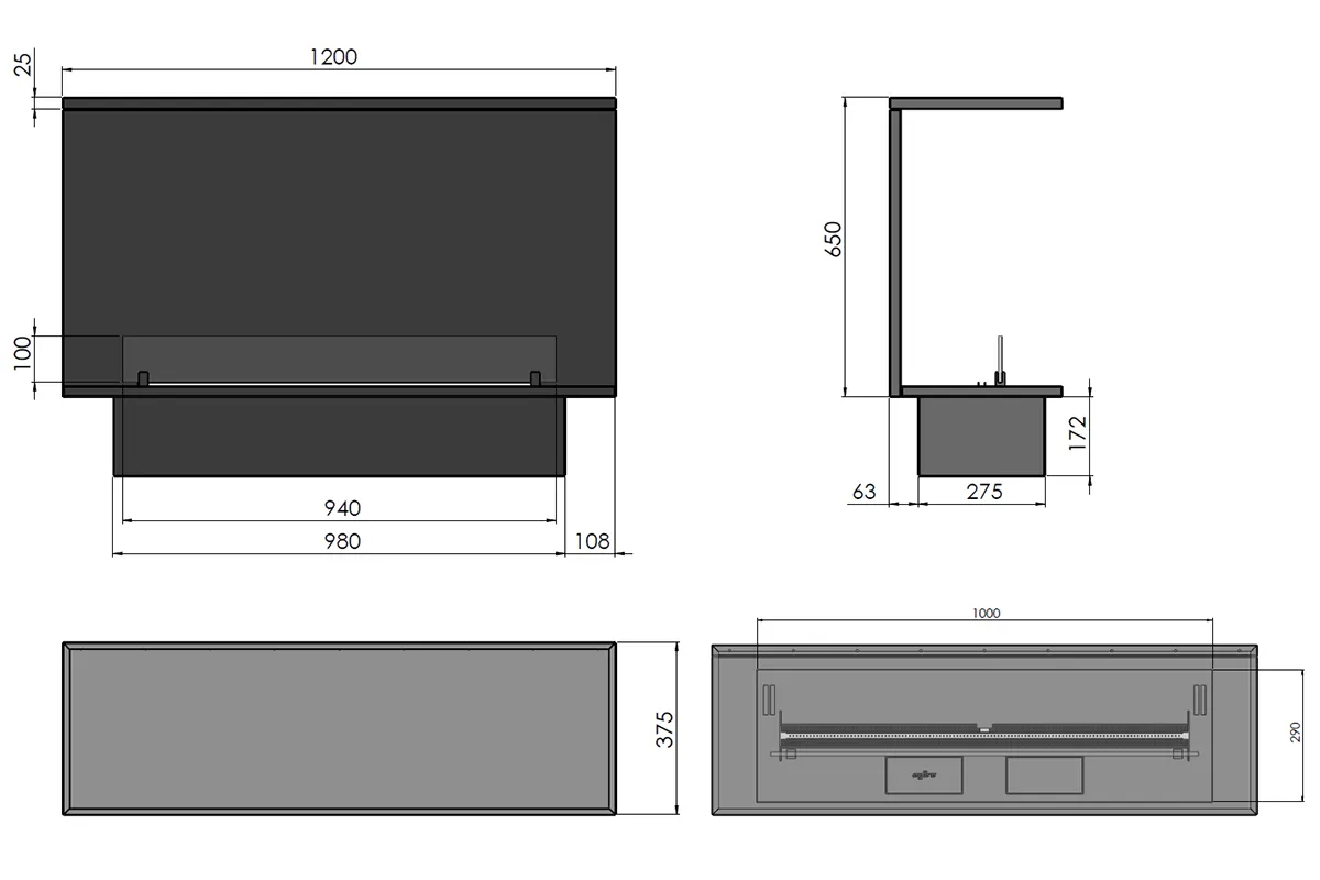 Biokominek z obudową INFIRE ETRONIC C 1200 jest wyposażony w jedną szybę ochronną o grubości 8 mm wykonaną z bezbarwnego hartowanego szkła OptiWhite o prostokątnych narożnikach. Szyba ma wymiary 94 x 10 cm.