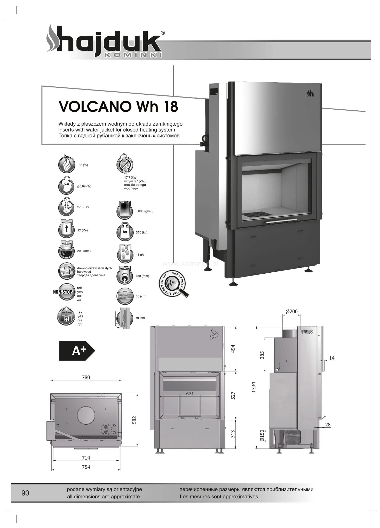 HAJDUK VOLCANO Wh-18 to wkład kominkowy z płaszczem wodnym przystosowany do pracy w udkładzie zamkniętym. Wkład wyposażony został w zamknięte naczynie wyrównawcze, które wykazuje odporność na działanie wysokich temperatur. Posiada także specjalną wężownicę schładzającą, przez którą odprowadzany jest nadmiar ciepła z urządzenia, co zapobiega jego przegrzaniu się. W wężownicy obecny jest także zawór, który po przekroczeniu pewnych norm otwiera się i pozwala na dopływ zimnej wody do wężownicy. Rozwiązanie to pozwala na natychmiastowe obniżenie zbyt wysokiej temperatury kominka.