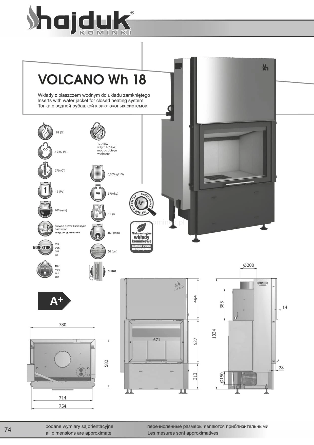 HAJDUK VOLCANO WTh-18 to wkład kominkowy z płaszczem wodnym przystosowany do pracy w udkładzie zamkniętym. Wkład wyposażony został w zamknięte naczynie wyrównawcze, które wykazuje odporność na działanie wysokich temperatur. Posiada także specjalną wężownicę schładzającą, przez którą odprowadzany jest nadmiar ciepła z urządzenia, co zapobiega jego przegrzaniu się. W wężownicy obecny jest także zawór, który po przekroczeniu pewnych norm otwiera się i pozwala na dopływ zimnej wody do wężownicy. Rozwiązanie to pozwala na natychmiastowe obniżenie zbyt wysokiej temperatury kominka.