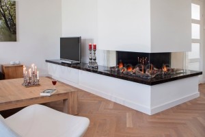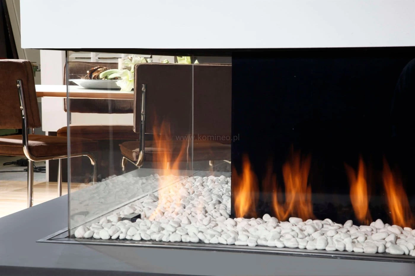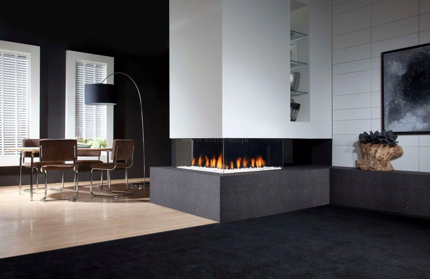 - Narożna zabudowa kominka umożliwia niepowtarzalny widok na palenisko z kilku stron.