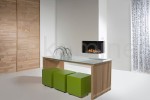 Bez względu na ich wysokość, okazałe, bujne płomienie Flat Burner® wypełniają niemalże całą szerokość płyty paleniska. Obraz ten uzupełniają elementy dekoracyjne – poziomo usytuowane, realistycznie wyglądające polana, białe otoczaki Carrara lub szary grys. Pracą kominka można sterować za pomocą pilota zdalnego sterowania.