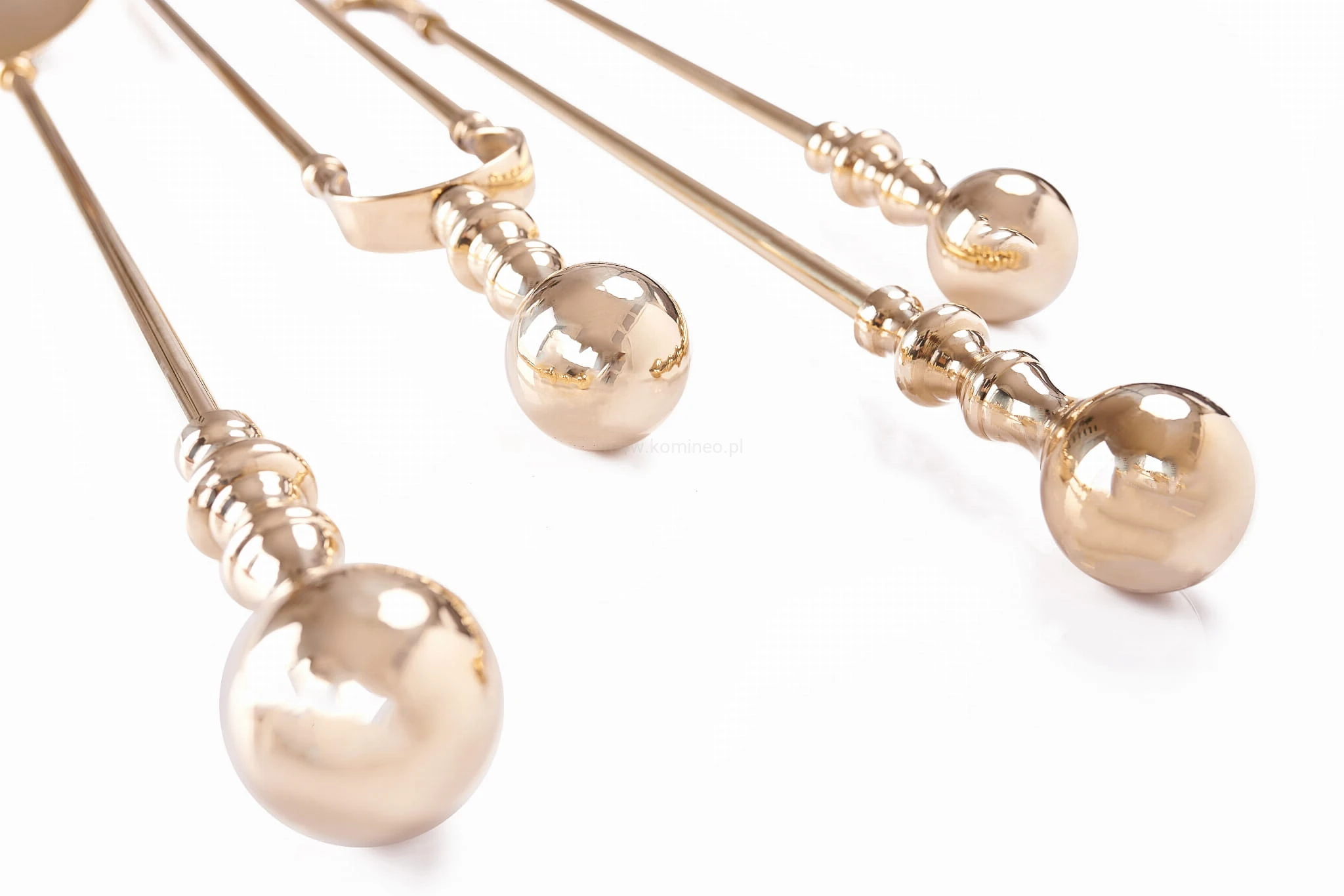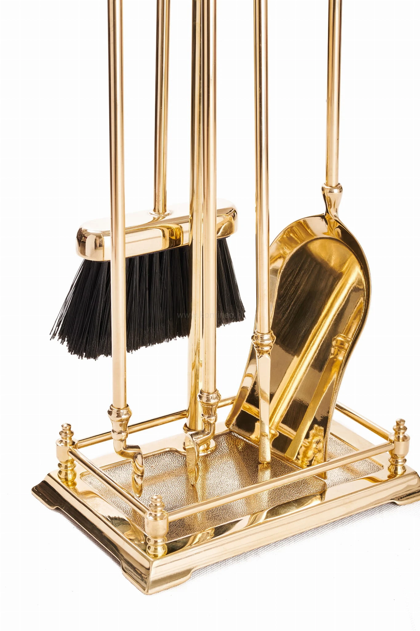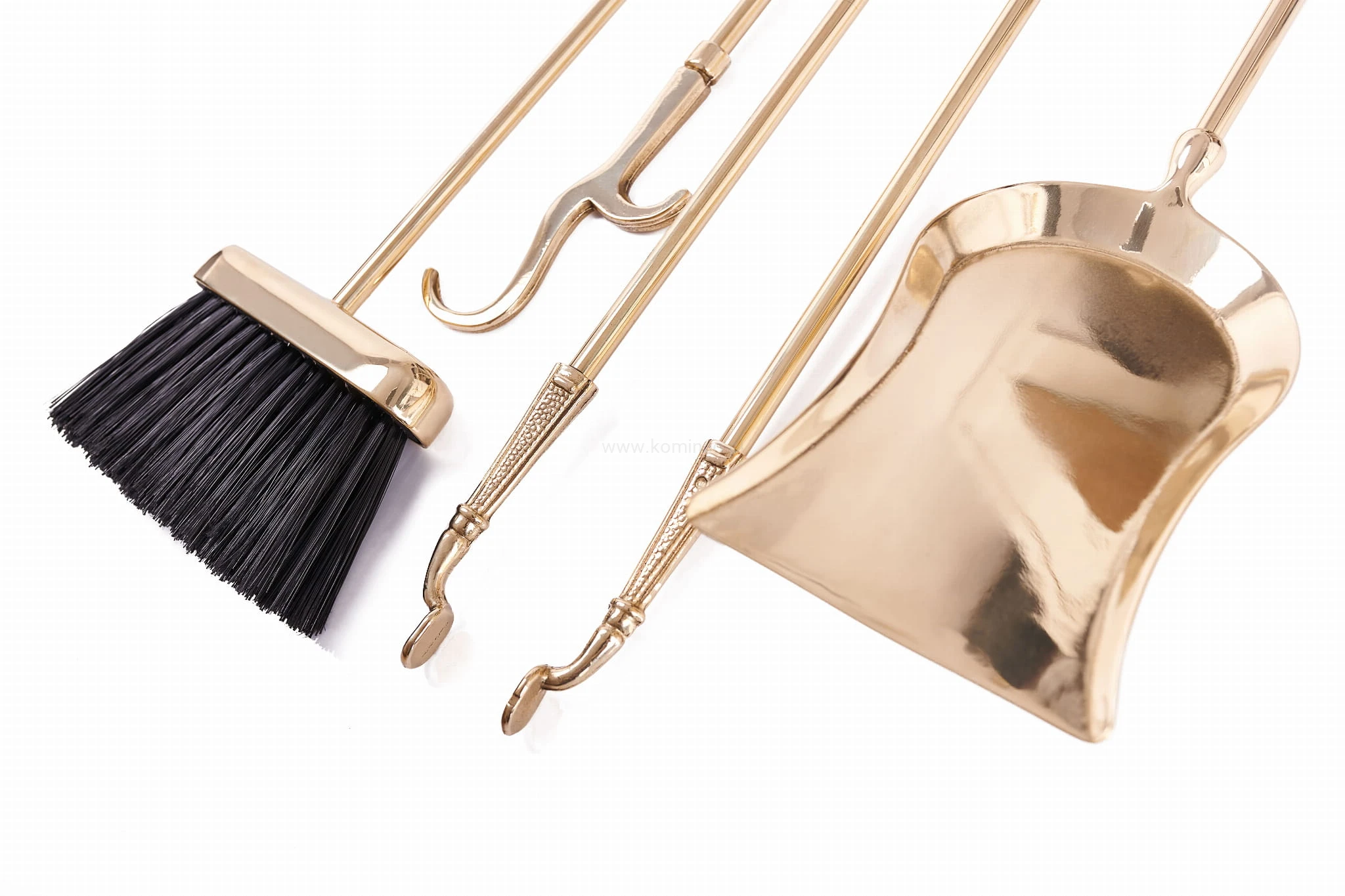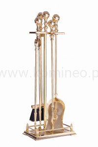 Wysokiej jakości zestaw akcesoriów do Twojego kominka od renomowanego producenta ekskluzywnej linii – ArtFuego. Ten elegancki i praktyczny zestaw kominkowy jest niezbędny dla każdego posiadacza kominka lub pieca kominkowego. Został on wyprodukowany z wielką dbałością o szczegóły z mosiądzu w wersji polerowanej, który ma barwę prawdziwego złota. Zestaw składa się z czterech elementów: miotełka, szufelka, pogrzebacz oraz szczypce – wszystkie zakończone wygodnymi rączkami w kształcie kuli. Całość znajduje się na stabilnej, prostokątnej podstawie. Zarówno wzór jak i kolor tego zestawu nadają mu styl klasyczny i nieco pałacowy.