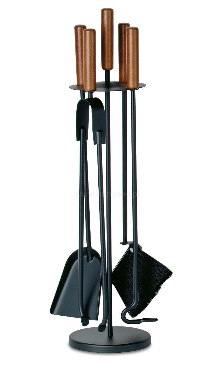 - Informacje dodatkowe (wykończenie) stal czarna z elementami drewna; 4 elementy: szczotka, szufelka, pogrzebacz, szczypce