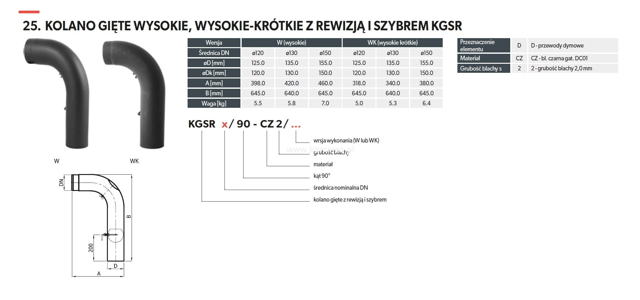 Przyłącza kominowe wykonane są z blach stalowych czarnych w gatunku DC01 (wg EN-10130/07) o grubości 2,0 mm. Stosuje się je jako przyłącza do odprowadzenia spalin z kominków i urządzeń grzewczych na paliwa stałe pracujących bez kondensacji.