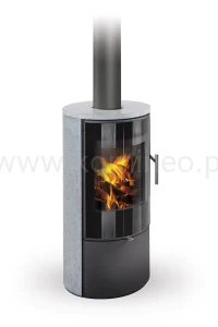 ROMOTOP LAREDO kamień to stalowy piec kominkowy o nowoczesnym designie z okładziną zewnętrzną wykonaną z kamienia naturalnego, tj. szarego steatytu oraz drzwiczkami pokrytymi w całości szkłem z ozdobnym czarnym nadrukiem.