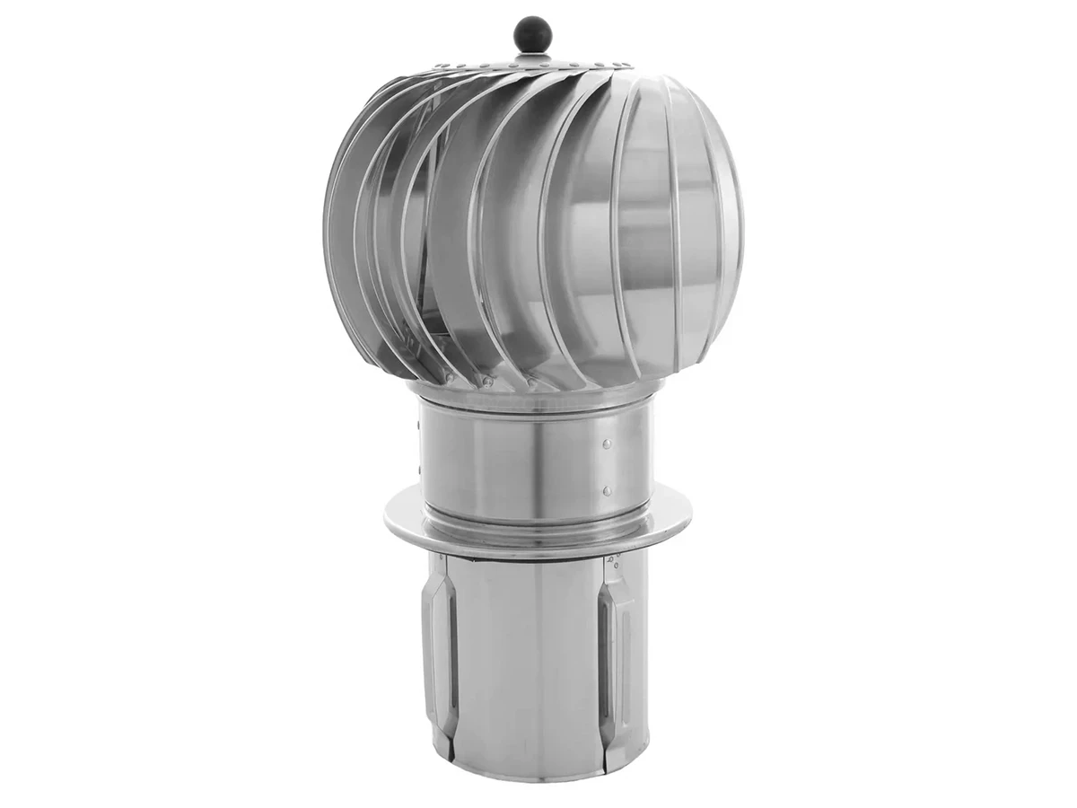 Turbowenty TU150-CHAL-PT montuje się na szczycie przewodu kominowego w celu poprawy ciągu kominowego w kanałach wentylacji grawitacyjnej. Obracająca się pod wpływem wiatru turbina wytwarza podciśnienie w przewodzie, zwiększając natężenie przepływu powietrza i wydajność instalacji wentylacyjnej oraz zapobiegając ciągowi wstecznemu. Turbina nasady kominowej obraca się zawsze w tą samą stronę, niezależnie od kierunku, siły i rodzaju wiatru (wiatr poziomy, opadający, wznoszący).