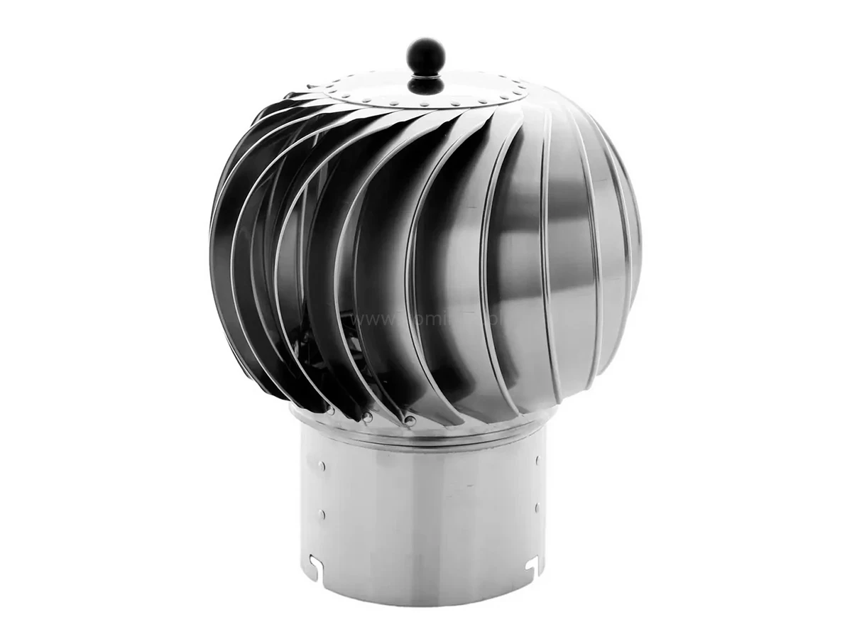 Turbowenty TU150-CHCH-R montuje się na szczycie przewodu kominowego w celu poprawy ciągu kominowego w kanałach wentylacji grawitacyjnej. Obracająca się pod wpływem wiatru turbina wytwarza podciśnienie w przewodzie, zwiększając natężenie przepływu powietrza i wydajność instalacji wentylacyjnej oraz zapobiegając ciągowi wstecznemu. Turbina nasady kominowej obraca się zawsze w tą samą stronę, niezależnie od kierunku, siły i rodzaju wiatru (wiatr poziomy, opadający, wznoszący).