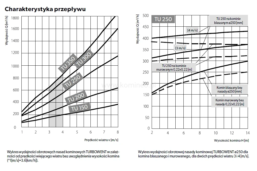 Turbowenty TU250-CHAL-BIII montuje się na szczycie przewodu kominowego w celu poprawy ciągu kominowego w kanałach wentylacji grawitacyjnej. Obracająca się pod wpływem wiatru turbina wytwarza podciśnienie w przewodzie, zwiększając natężenie przepływu powietrza i wydajność instalacji wentylacyjnej oraz zapobiegając ciągowi wstecznemu. Turbina nasady kominowej obraca się zawsze w tą samą stronę, niezależnie od kierunku, siły i rodzaju wiatru (wiatr poziomy, opadający, wznoszący).