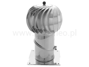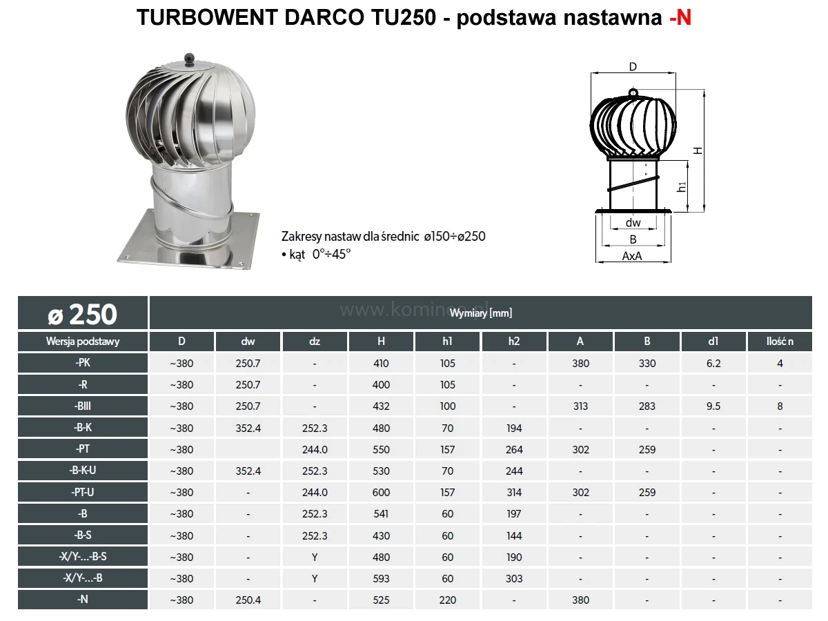 Turbowent DARCO TU250-CHAL-N to obrotowa nasada kominowa o średnicy przyłącza ø250 mm, kwadratowej podstawie nastawnej wykonanej z blachy chromoniklowej oraz obrotowej turbinie wykonanej z aluminium. Nasady DARCO w wersji -N ustawiamy na płycie dachu lub płycie komina oraz regulujemy kąt nachylenia w zakresie od 0º do 45º.