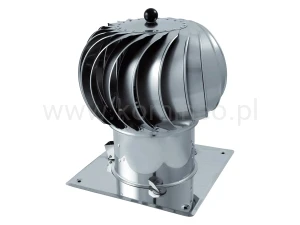 Turbowent DARCO TU250-CHAL-PK to obrotowa nasada kominowa o średnicy przyłącza ø250 mm, kwadratowej otwieranej podstawie wykonanej z blachy chromoniklowej oraz obrotowej turbinie wykonanej z aluminium.