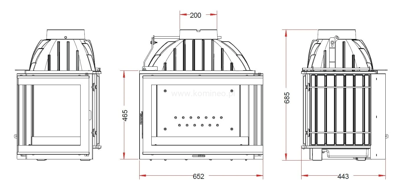 - Wymiary szyby / wizja ognia (wys. x szer.) 408 x 631,5/373 mm
